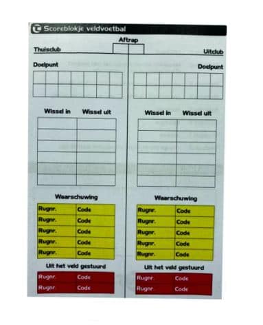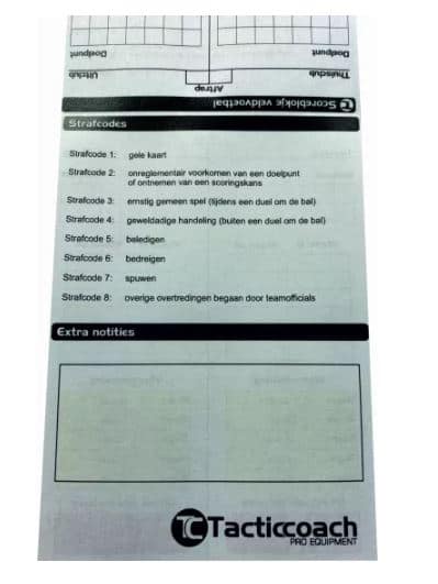 Tacticcoach Scoreblokje voetbal is perfect voor elke scheidsrechter! Zo worden de scoreblokjes gebruikt tijdens voetbalwedstrijden bij zowel jeugd- als seniorenvoetbal. Op de scoreblokjes kun je eenvoudig de doelpuntenmakers, wissels, kaarten en extra notities kwijt. Op de achterkant van het Tacticcoach scoreblokje staan de strafcodes vermeld.